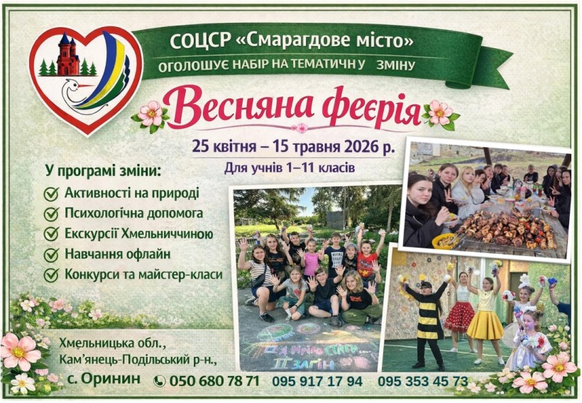 The “Emerald City” Sanatorium and Health Center for Social Rehabilitation, which has now been relocated to the village of Orinyn in the Kamianets-Podilskyi District of the Khmelnytskyi Region, invites children aged 7 to 17 from the Donetsk Region to participate in educational, recreational, and social rehabilitation programs.