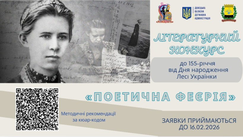 From February 4 to 25, 2026, the Donetsk Youth Palace "Yunist" is holding an online literary competition "Poetic Extravaganza" dedicated to the 155th anniversary of Lesya Ukrainka's birth.
