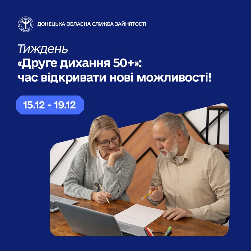 The Donetsk Regional Employment Service invites people aged 50+ to join the themed week “Second Wind 50+” — a series of events designed to help you find your place in today’s labor market and move forward with confidence.