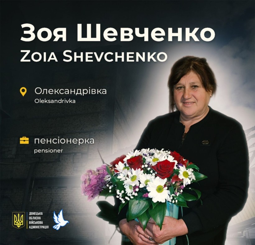 The life of 63-year-old Zoia Shevchenko was taken by a Russian airstrike on the settlement of Yarova on September 9, 2025.