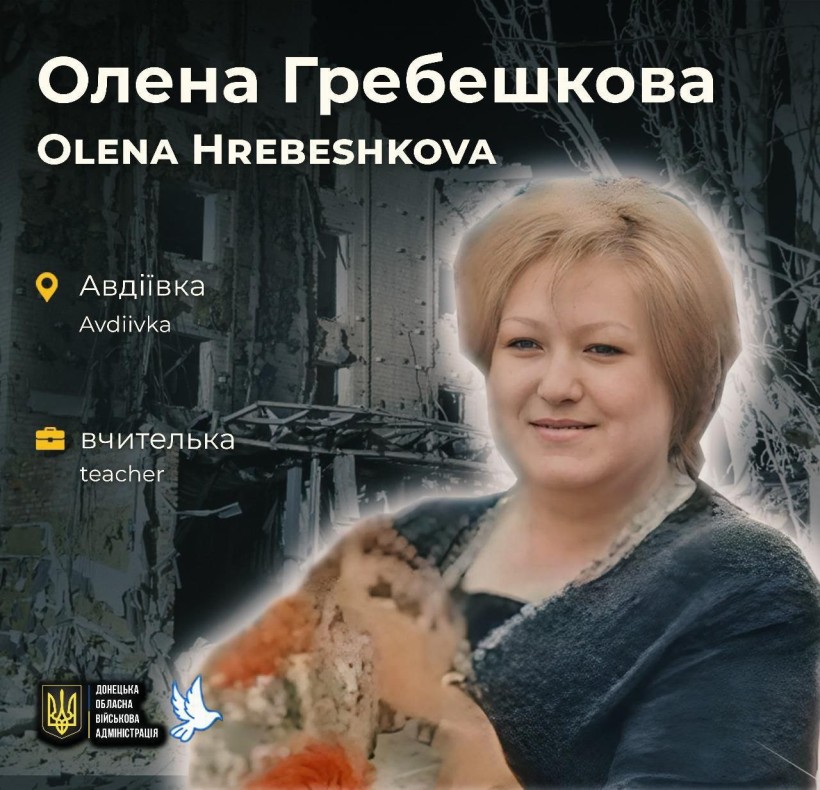Olena Hrebeshkova was a teacher of Russian language and literature, as well as a homeroom teacher at Avdiivka School No. 2.