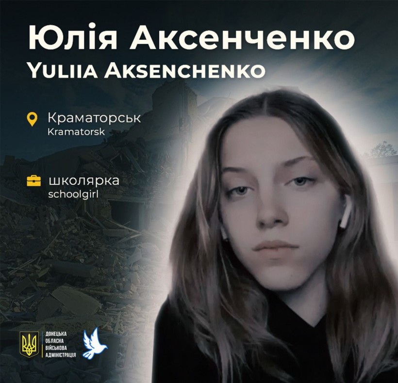14-year-old Yuliia Aksenchenko was killed on June 27, 2023, when Russian forces launched missile strikes on the center of Kramatorsk and the village of Bilenke.