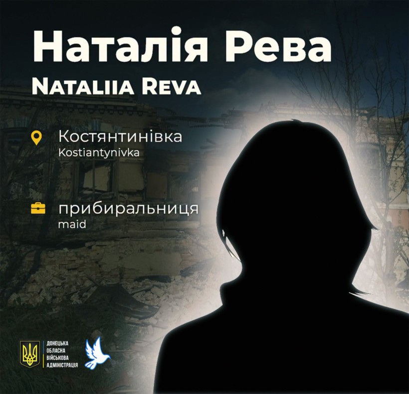 Nataliia Reva was killed on April 9, 2024, in a Russian attack on her hometown of Kostiantynivka.