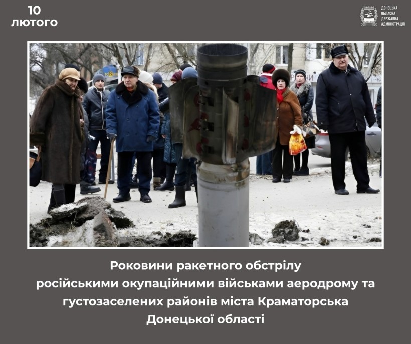 10 лютого 2015 року російські окупаційні війська обстріляли з важкого артилерійського озброєння аеродром та густозаселені райони міста Краматорська. Цей кривавий терористичний акт, скоєний російськими найманцями під час війни на сході України, забрав життя 17 людей. 64 людини, серед яких п’ятеро дітей, дістали поранення. Внаслідок обстрілу було пошкоджено 41 будівлю.