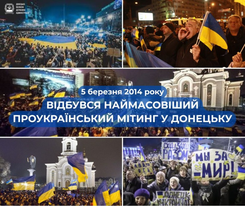 5 березня 2014 року в Донецьку відбувся наймасовіший проукраїнський мітинг періоду початку російської агресії проти України. Близько 10 000 осіб взяли участь у заході. Акція пройшла на тлі загострення суспільно-політичної ситуації після Революції Гідності та окупації росією Автономної Республіки Крим.