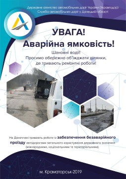 На автомобільних дорогах загального користування державного значення Донецької області тривають роботи із забезпечення безаварійного проїзду. Ділянки автошляхів, уражені новоутвореними вибоїнами, до виконання оперативних заходів облаштовуються тимчасовими дорожніми знаками: 1.10 «Нерівна дорога», 1.12 «Вибоїна» та 3.29 «Обмеження максимальної швидкості» (відповідно до ДСТУ 8749:2017 «Безпека дорожнього руху. Огородження та організація дорожнього руху в місцях проведення дорожніх робіт»).