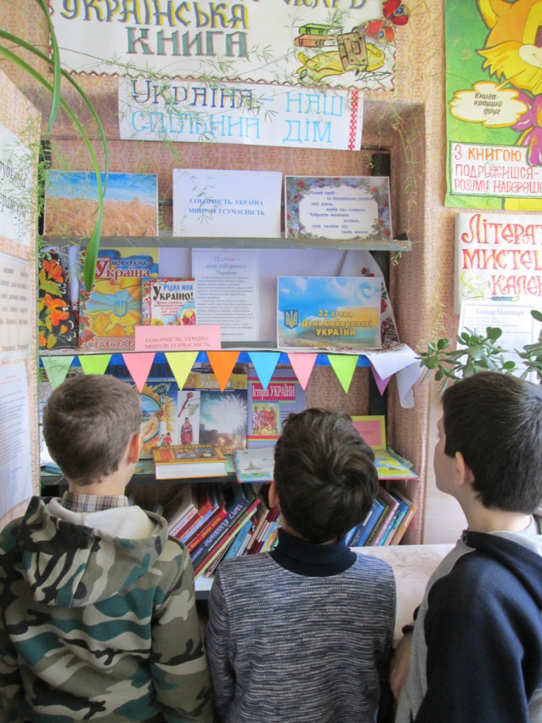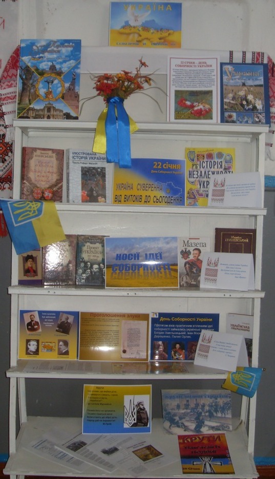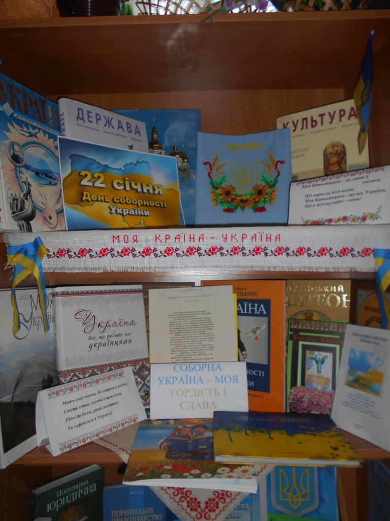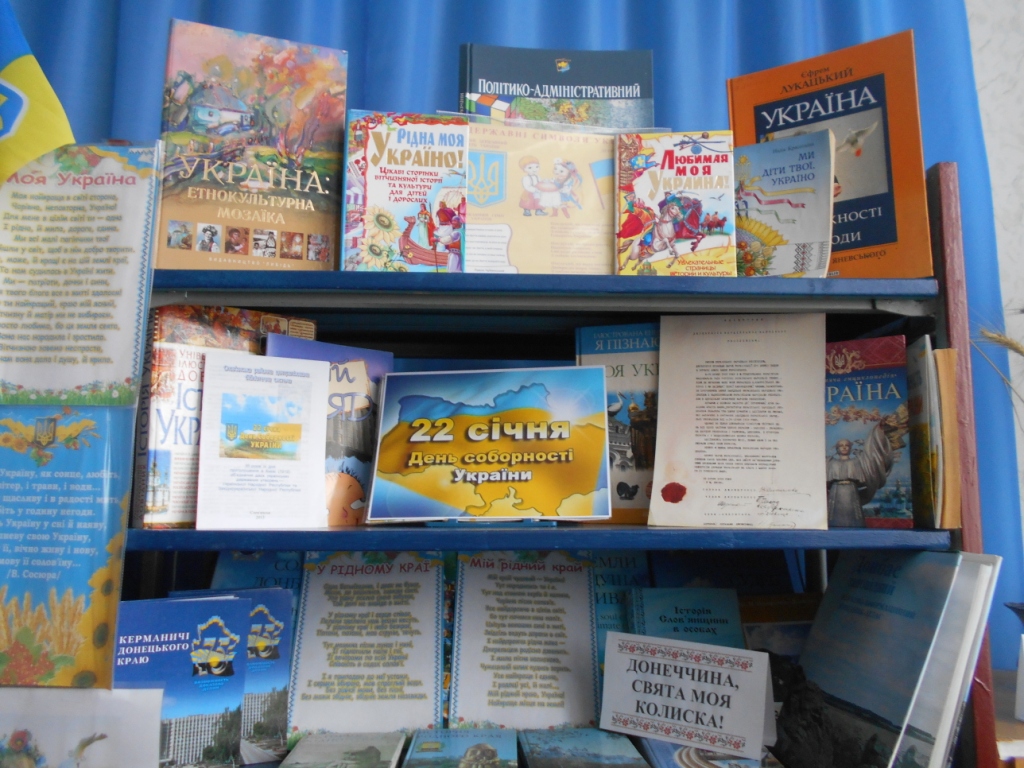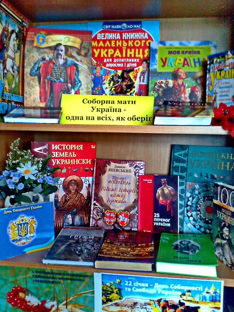 З метою належного відзначення Дня Соборності України, забезпечення національної єдності та громадянської злагоди, виховання у громадян патріотизму та гордості за героїчне минуле та сьогодення Українського народу, до знаменної події в бібліотеках-філіях КЗ «Слов’янська РЦБС» для широкого загалу користувачів з 18 січня по 23 січня 2017 року пройшов цикл заходів «Україна – Соборна й Єдина».