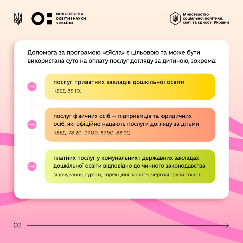 Допомога є цільовою і може бути використана суто на оплату послуг догляду за дитиною, зокрема: