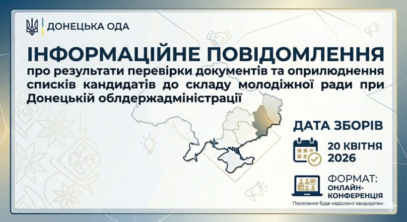 Ініціативна група з підготовки установчих зборів для формування нового складу молодіжної ради при Донецькій обласній державній адміністрації повідомляє про завершення етапу розгляду документів, поданих кандидатами у період з 6 по 20 березня 2026 року.