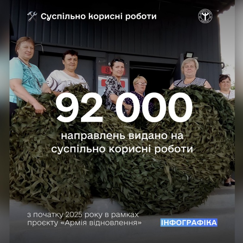 За час дії програми «Армія відновлення» з 2022 року ДСЗ видано 308 тисяч направлень на суспільно корисні роботи та профінансовано їх у розмірі 2,7 мільярда гривень.