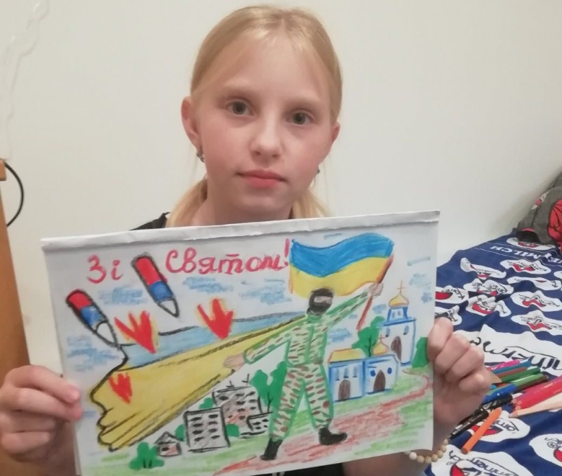Хлопець, вихованець Донецького центру технічної творчості дітей та юнацтва, демонструє свій патріотичний малюнок до Дня Захисників і Захисниць України.