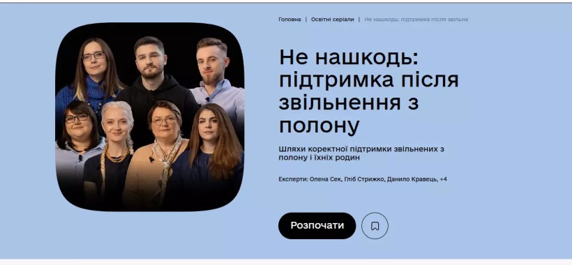 Освітній серіал «Не нашкодь: підтримка після звільнення з полону» (10 серій), розміщений на платформі Дія.Освіта – про міфи й реальність полону, повернення відчуття безпеки та фахову підтримку.