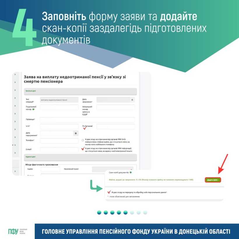 Подати заяву на виплату недоотриманої пенсії за померлого пенсіонера можна через вебпортал Пенсійного фонду України https://portal.pfu.gov.ua, авторизувавшись за допомогою кваліфікованого електронного підпису (КЕП).