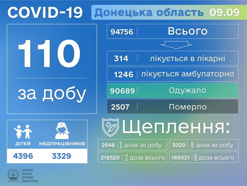 Всього з початку пандемії у Донецькій області на COVID-19 захворіли 94756 осіб, з них 90689 одужало.