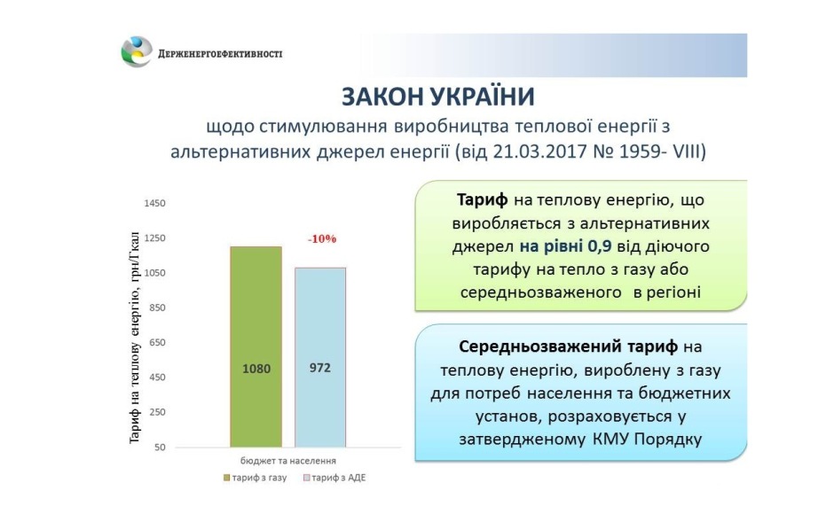 На виконання вимог Закону України від 21 березня 2017 року № 1959-VІІІ щодо стимулювання виробництва тепла з альтернативних джерел енергії органи місцевого самоврядування та НКРЕКП до 10 числа останнього місяця кожного кварталу мають подавати до Держенергоефективності інформацію для розрахунків середньозважених тарифів на теплову енергію, вироблену з використанням газу, для потреб населення, установ та організацій, що фінансуються з державного чи місцевого бюджету, а також її транспортування та постачання.