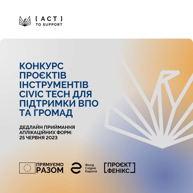 Розпочато відбір до акселераційної програми та конкурсу цифрових інструментів «Act to Support». Підтримаємо проєкти нових інструментів або покращення наявних: чат-ботів, сайтів, застосунків тощо.
