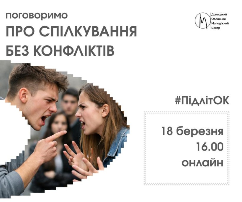 У межах програми «ПідлітОК!» Донецький обласний молодіжний центр запрошує молодь 13-17 років на онлайн-зустріч на тему «Спілкування без конфліктів».