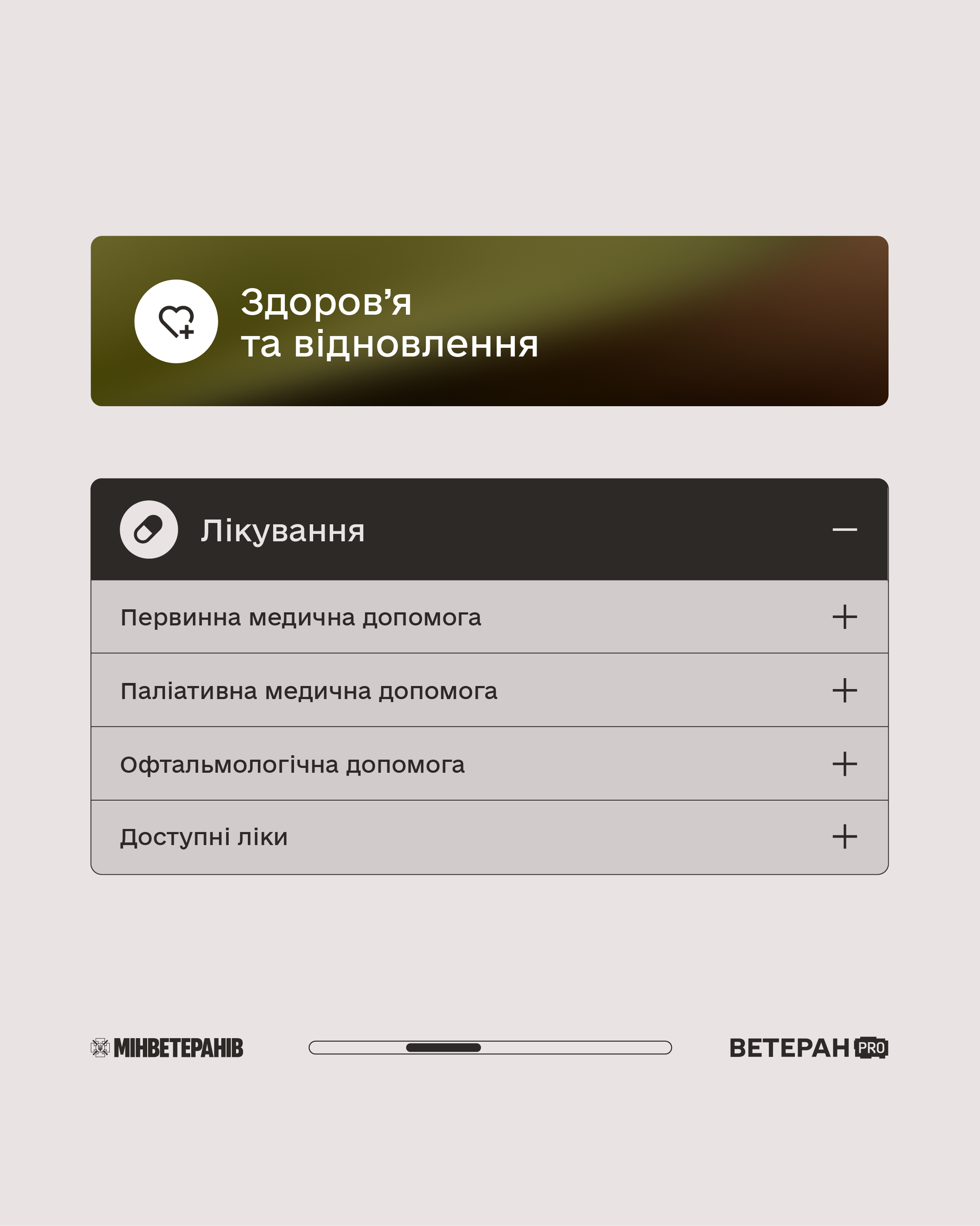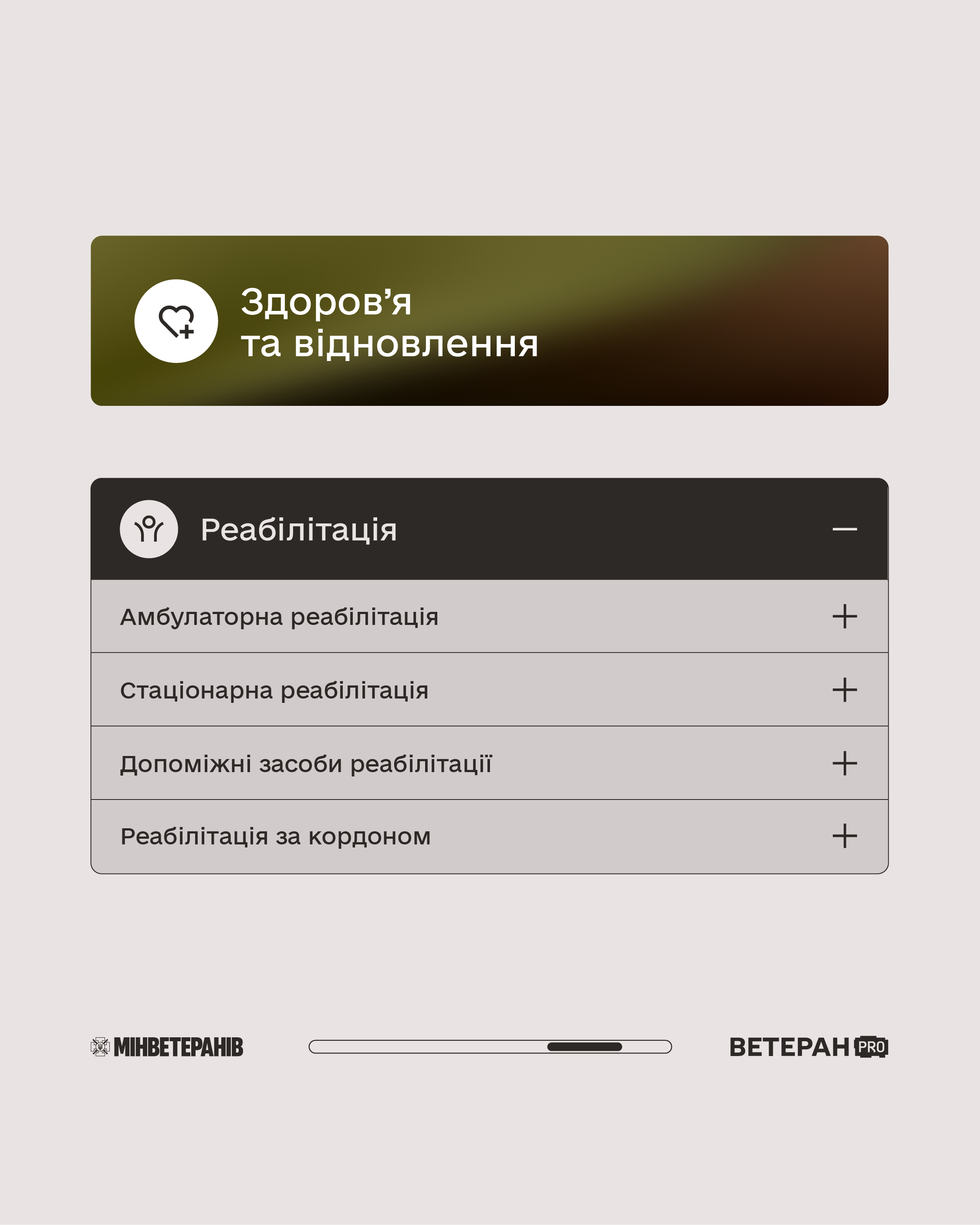 - Реабілітація — амбулаторна й стаціонарна, допоміжні засоби реабілітації, а також можливість реабілітації за кордоном.