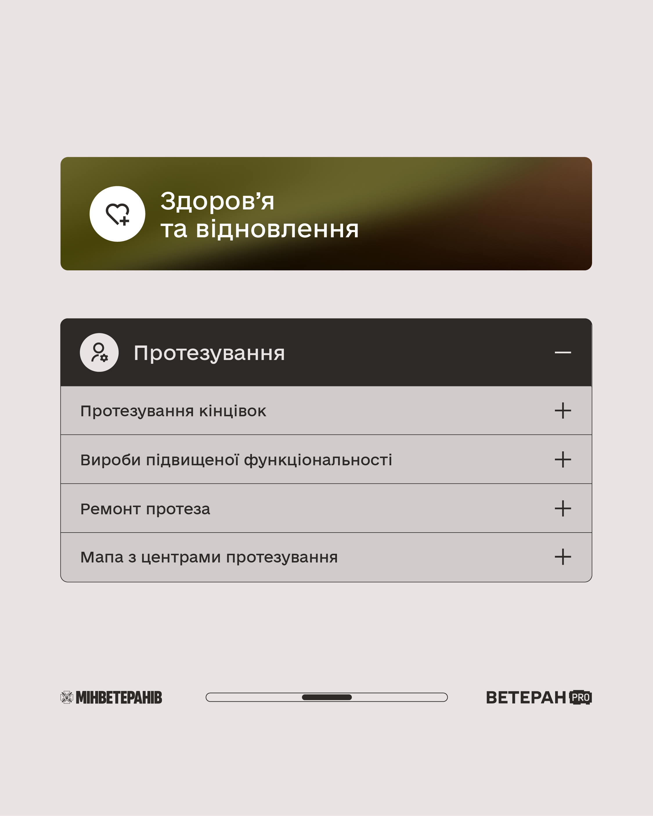 - Протезування — протези кінцівок, вироби підвищеної функціональності, ремонт протезів і мапа центрів протезування.