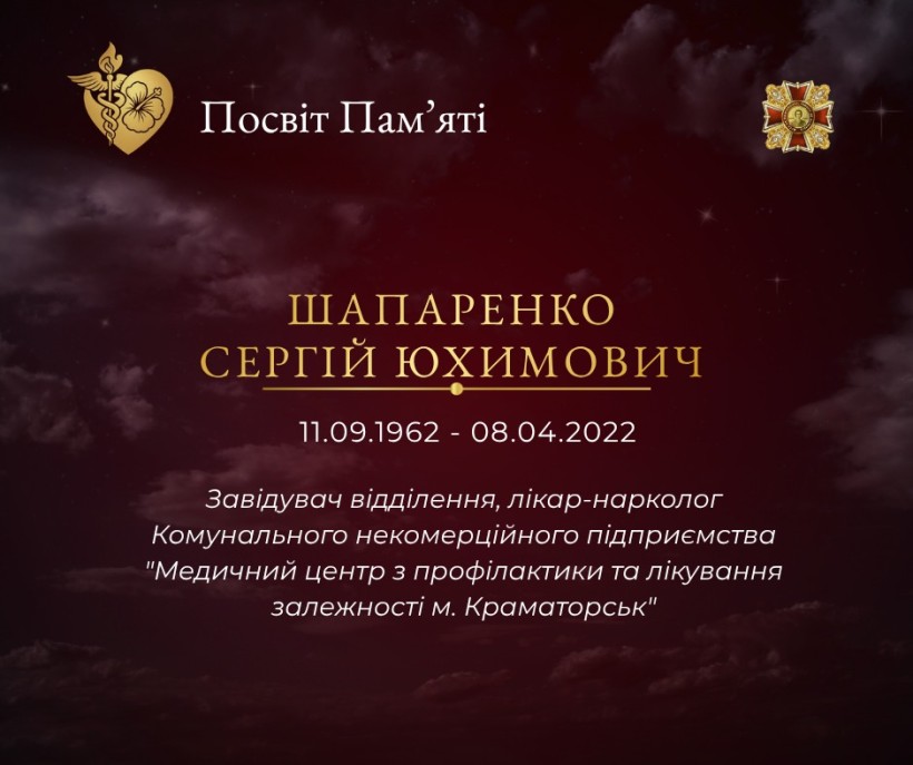 8 квітня 2022 року, Краматорський залізничний вокзал. Вся Донеччина та Україна пам’ятає ті жахливі події, під час яких загинула величезна кількість людей унаслідок нанесеного удару рф ракетою 9М79К-1 «Точка-У» з касетними боєприпасами. На превеликий жаль, серед жертв був і Сергій Шапаренко - лікар-нарколог Краматорського медичного центру з профілактики та лікування залежності.