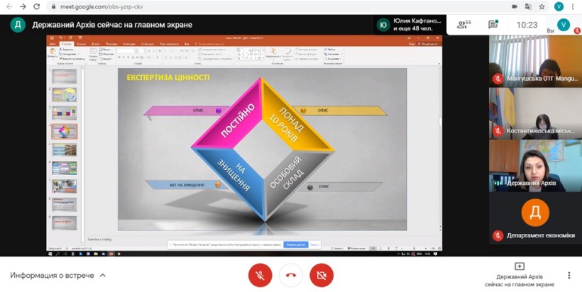 Співробітниця державного архіву Донецької області ознайомила слухачів з основними вимогами до організації архівного зберігання в територіальних громадах та зауважила, що недбале зберігання, псування, незаконне знищення архівних документів є адміністративним правопорушенням. Доповідачка закликала присутніх ставитись з відповідальністю до організації архівного зберігання в громадах, оскільки архівний фонд – це сукупність документів, що відображають історію духовного і матеріального життя народу, мають культурну цінність і є надбанням нації.