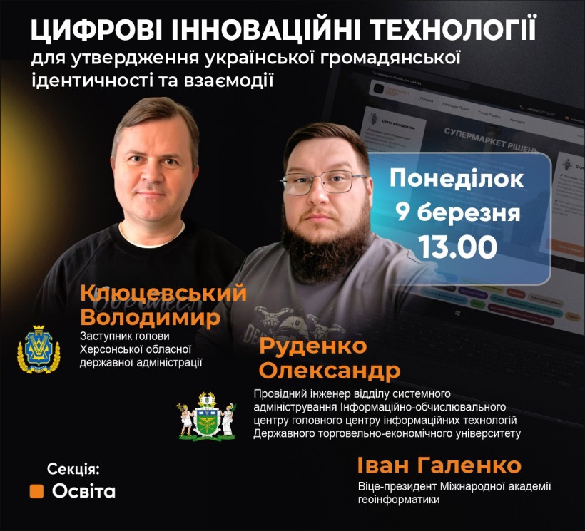 9 березня 2026 року з 13:00 до 14:00 на платформі Zoom відбудеться онлайн-подія «Цифрові інноваційні технології для утвердження української громадянської ідентичності та взаємодії». Захід організовує Міжнародна академія геоінформатики спільно з партнерами.