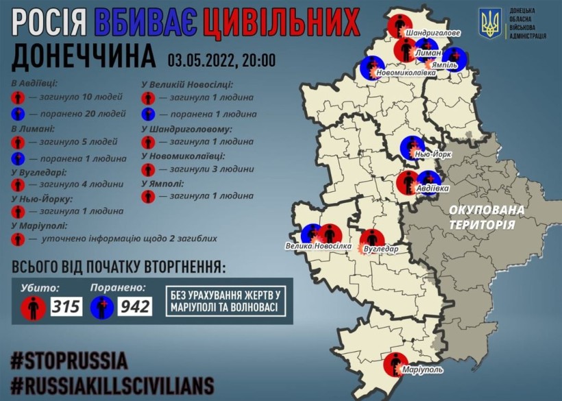 «Росія вбиває цивільних! За 3 травня росіяни вбили 21 мирного мешканця Донеччини і поранили ще 27. Це – найбільша кількість жертв за один день відтоді, як росіяни обстріляли залізничний вокзал Краматорська. Серед загиблих сьогодні цивільних 10 в Авдіївці, 5 у Лимані, 4 у Вугледарі, 1 у Великій Новосілці та 1 у Шандриголовому», - написав очільник області.