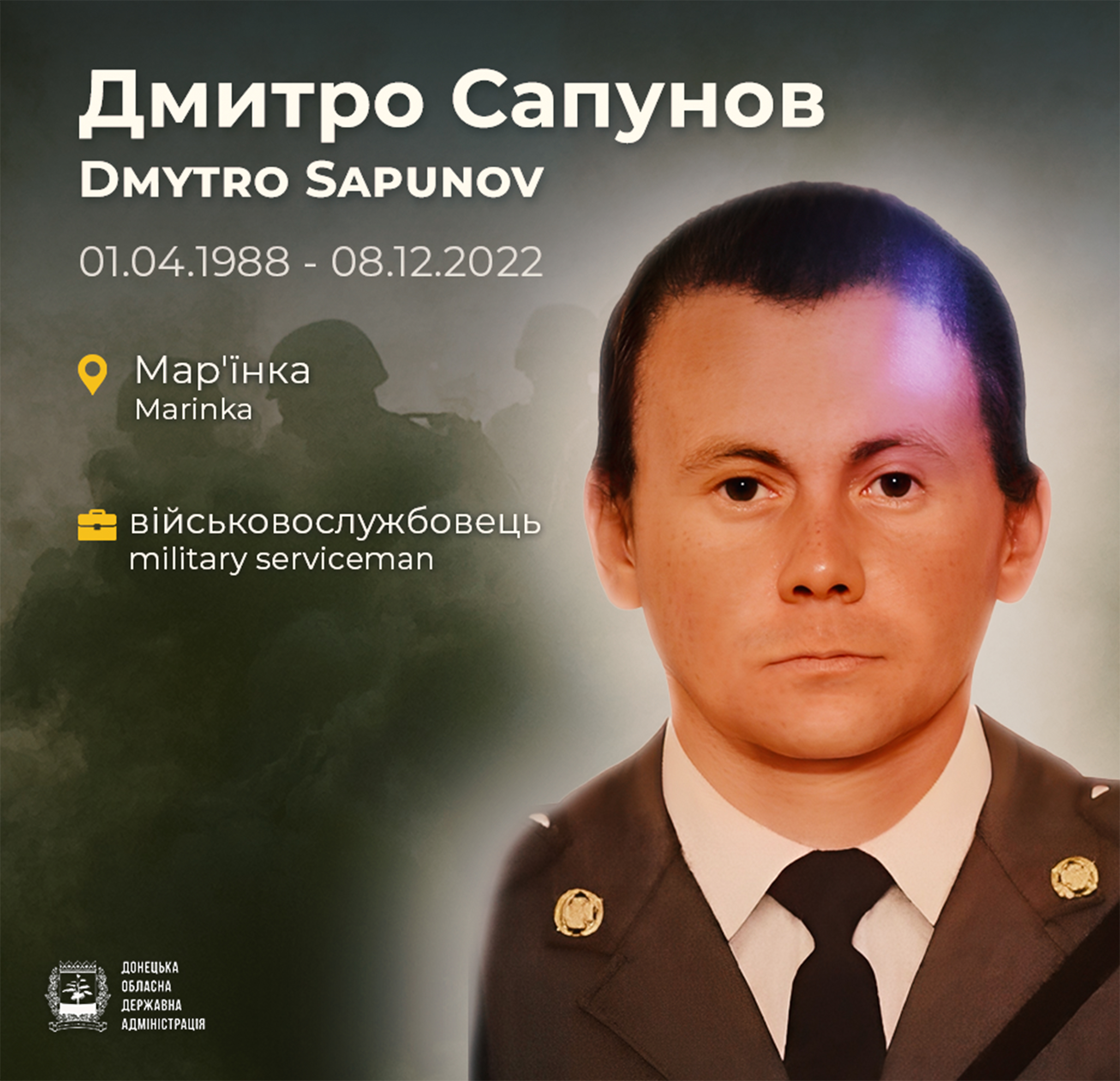Випускник Мар'їнської загальноосвітньої школи №2. Був людиною своєї землі, яка понад усе цінувала рідний дім. 25 серпня 2022 року був призваний до лав Збройних Сил України. Попри те, що його рідне місто вже було понівечене ворогом, Дмитро став на захист сусідньої Авдіївки, виконуючи свій обов'язок до останнього подиху.