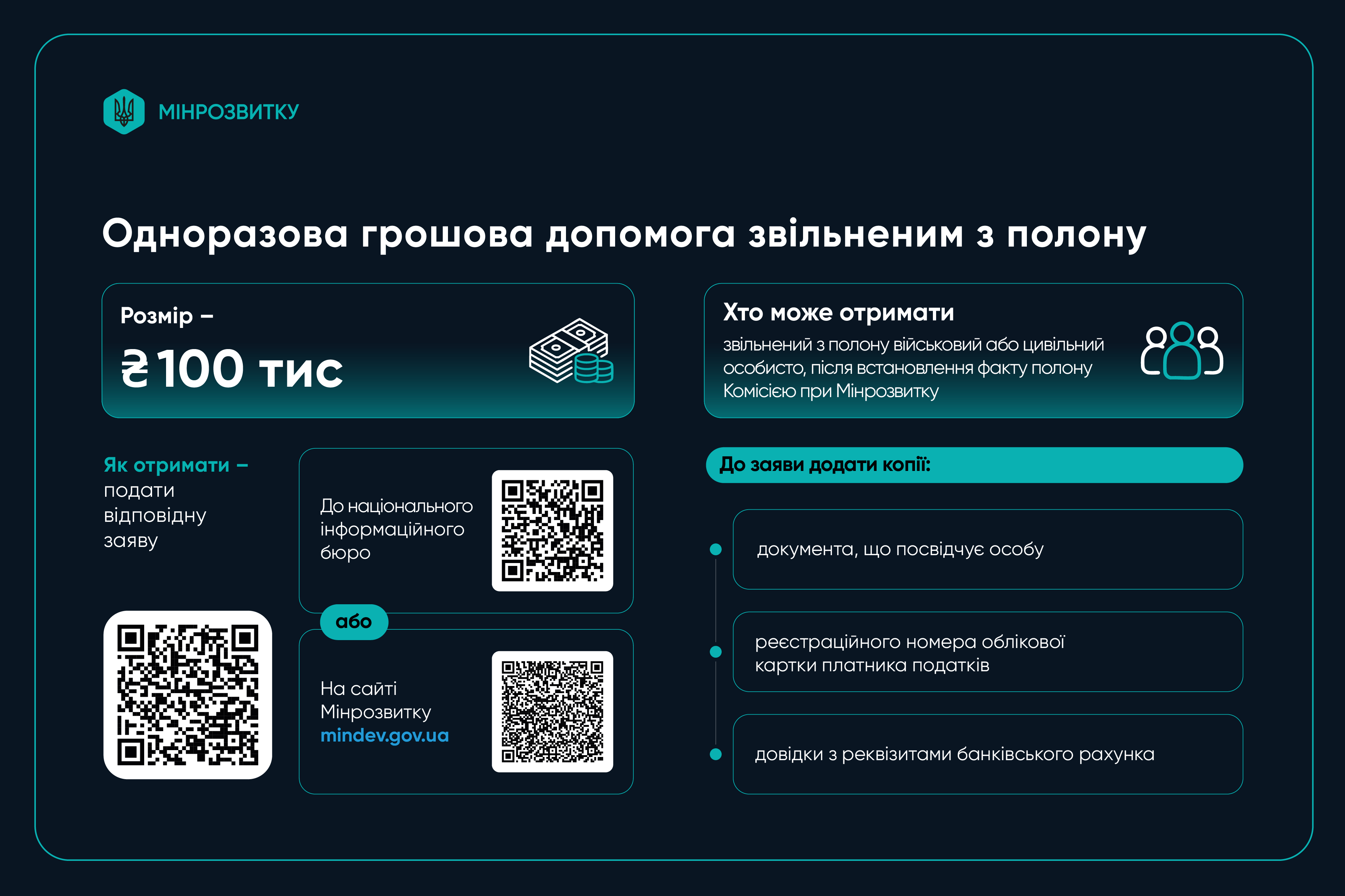 Одноразова грошова допомога звільненим з полону у розмірі 100 000 грн
