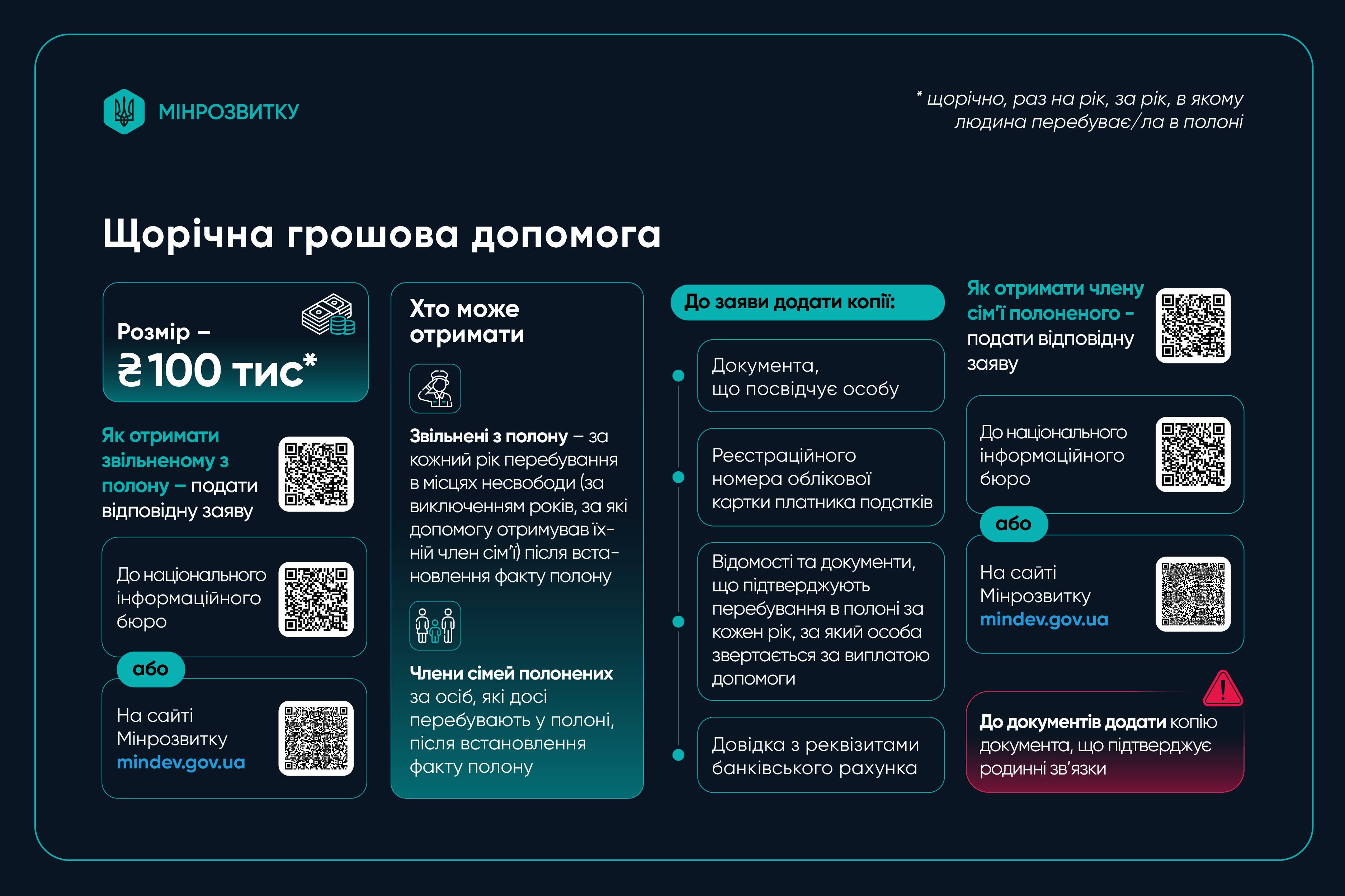 Її розмір – 100 тисяч грн, виплачується допомога – щорічно, раз на рік, за рік, в якому людина перебуває/ла в полоні