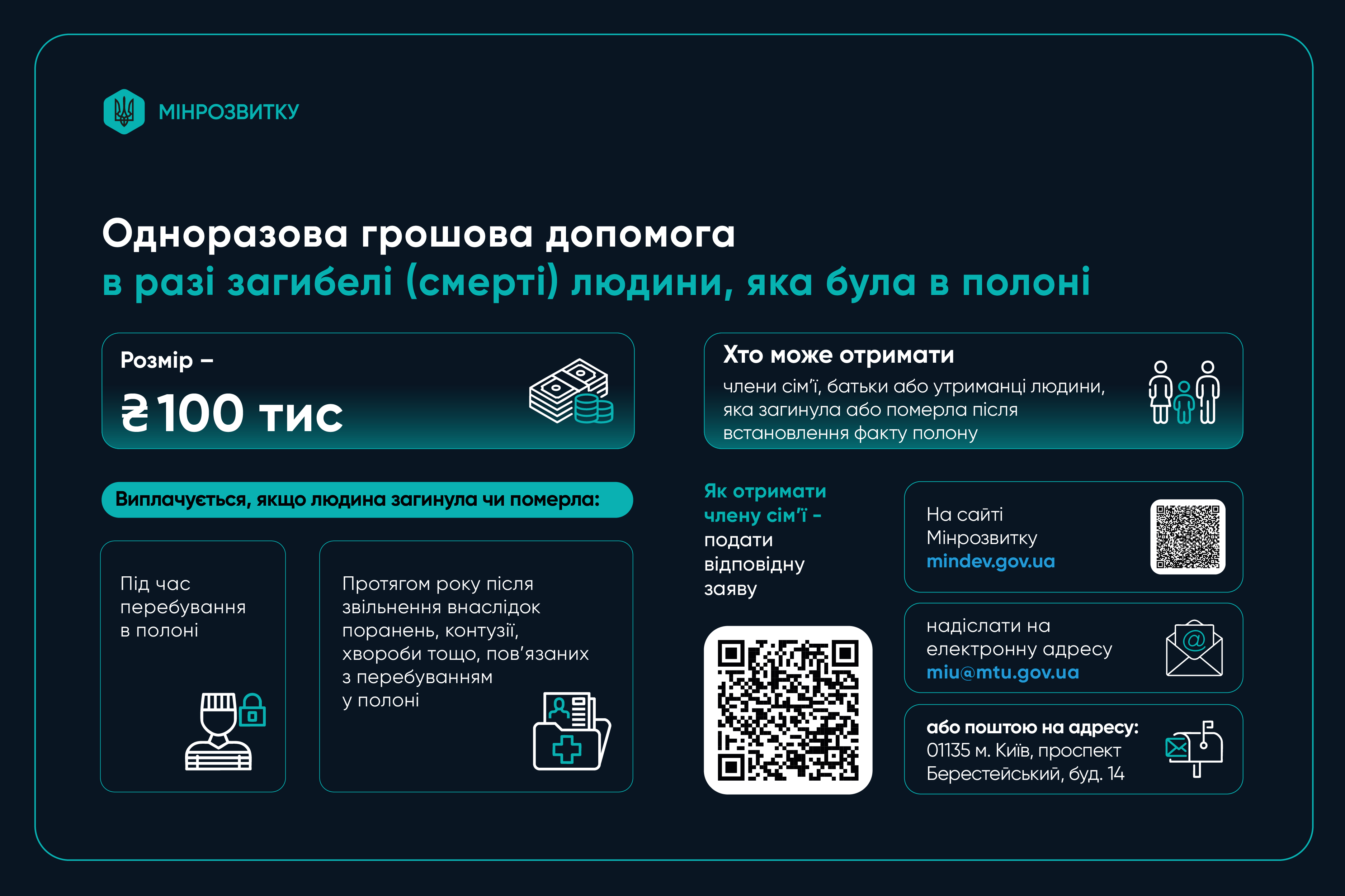 Також документи для отримання вищеперелічених виплат можна надіслати до Міністерства розвитку громад та територій України поштою на адресу 01135 м. Київ, проспект Берестейський, буд. 14 або на електронну пошту [email protected].