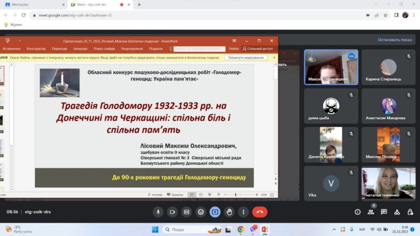 До 90-х роковин пам’яті жертв голодоморів в Україні у жовтні-листопаді 2023 року Донецькою обласною Малою академією наук учнівської молоді проведено обласний конкурс пошуково-дослідницьких робіт «Голодомор-геноцид: Україна пам’ятає», присвячений 90-м роковинам Голодомору 1932-1933 років в Україні. У конкурсі взяли участь учні закладів освіти з 24 територіальних громад Донецької області.