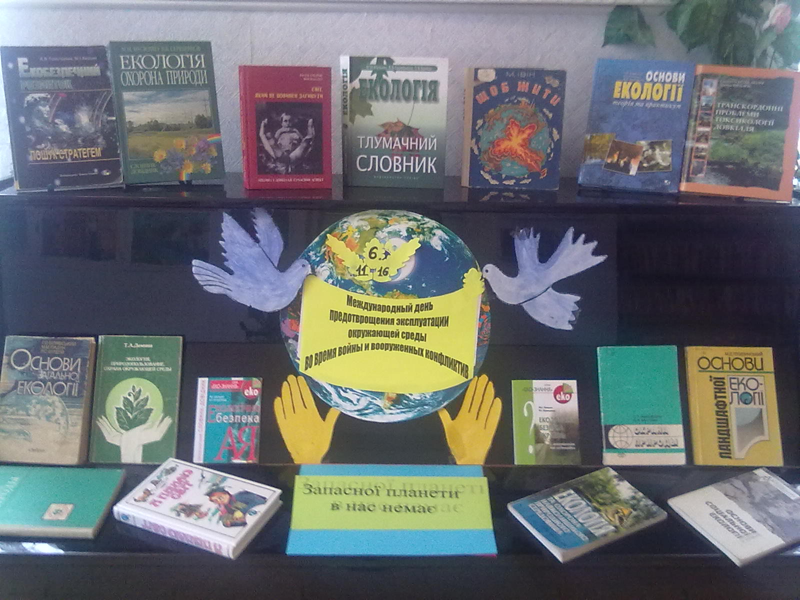 Бібліотеки району ведуть постійну просвітницьку роботу серед своїх читачів з метою привернення уваги до екологічних проблем та підвищення екологічної культури. Саме тому працівники Волноваської районної бібліотеки не змогли обійти своєю увагою таку значну дату як Міжнародний день запобігання експлуатації навколишнього середовища під час війн та збройних конфліктів (6 листопада). На жаль, наша країна безпосередньо зіштовхнулась з цією проблемою, тому сьогодні для України вона має особливо важливе значення.