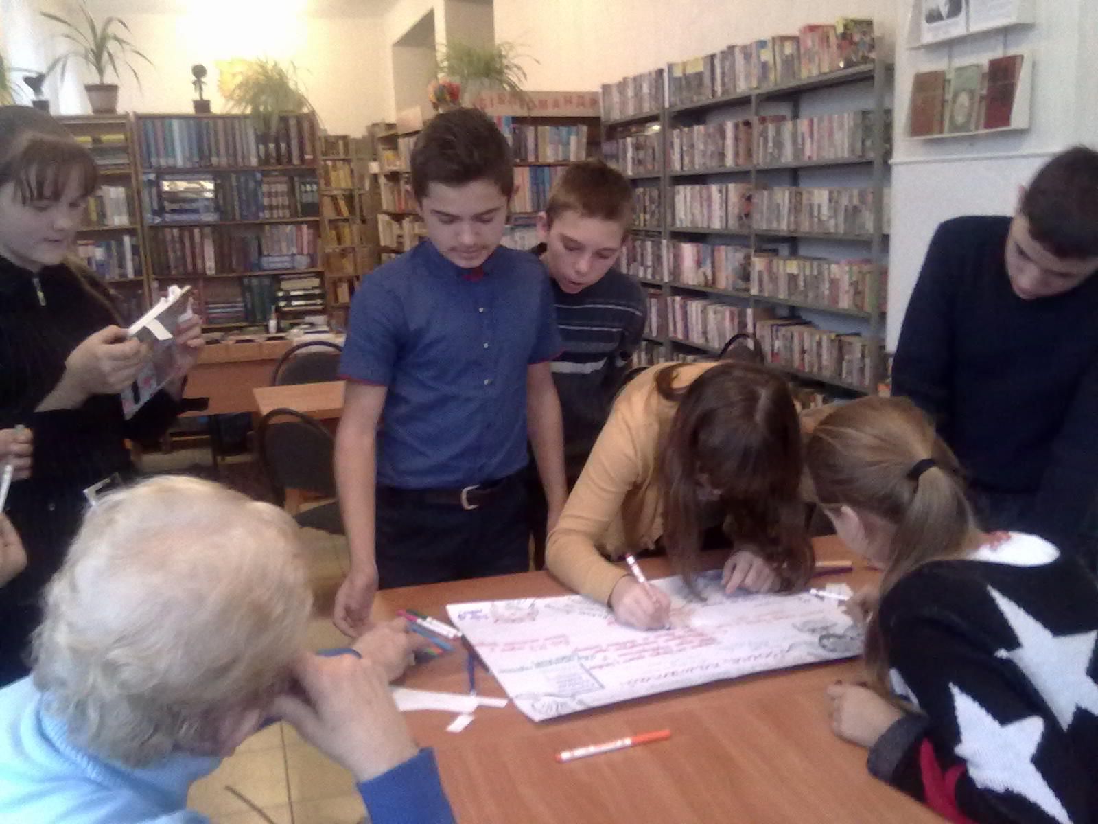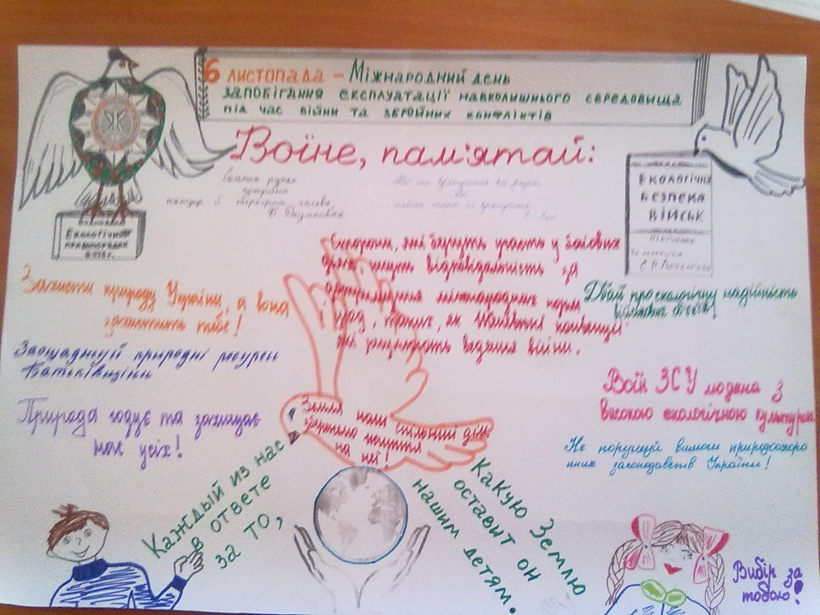 Учні 8-Б класу Волноваської ЗОШ №3, що завітали до бібліотеки на екологічний урок «Запасної країни в нас немає», дізналися багато цікавого з інтерактивної презентації: що саме спонукало прийняти таке рішення на Генеральній Асамблеї ООН у 2001 році; ознайомилися з причинами глобальних екологічних проблем; дізналися, до яких наслідків може привести порушення екологічної рівноваги. Приємно вразили учні відмінними знаннями з екології, склавши таблиці «Вплив людини на природу» та «Характер екологічних наслідків військових дій». Під час уроку школярі проявили й творчі здібності: склали вірші-заклики про охорону природи; створили наочну природоохоронну агітацію - екологічну пам'ятку, яку потім передали військовим району. Адже гарантування екологічної безпеки людини — невід'ємна умова сталого економічного та соціального розвитку України і є всенародною справою, оскільки вона неможлива без участі широких верств громадськості, в тому числі й армійської.