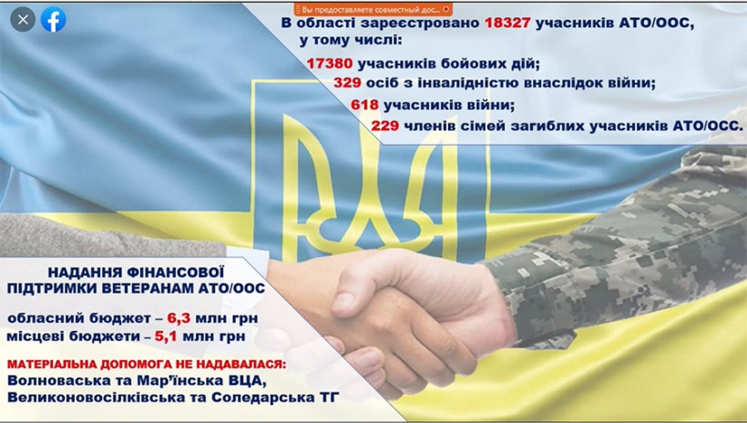 «За рахунок коштів обласного бюджету учасникам АТО та родинам загиблих надано фінансову підтримку на суму понад 6 млн гривень. Із місцевих бюджетів надано матеріальну допомогу на суму понад 5 млн гривень. Суттєва допомога надається зазначеній категорії громадян у Маріупольській, Лиманській, Покровській, Миколаївській, Добропільській територіальних громадах. У Волноваській ВЦА, Соледарській територіальній громаді виплати матеріальної допомоги зазначеній категорії зовсім не проводились. А в Великоновосілківській територіальній громаді та Мар’їнській ВЦА взагалі відсутня програма підтримки ветеранів війни з числа учасників АТО та родин загиблих захисників України, у зв’язку з чим допомога також не надавалась», - зазначила Олена Токарева.