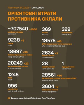 Загальні бойові втрати противника з 24.02.22 по 09.11.24 орієнтовно склали: