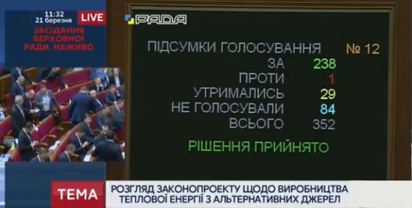 Сьогодні, 21 березня, на засіданні Верховної Ради України прийнято розроблений спільно з Держенергоефективності законопроект № 4334 щодо стимулювання виробництва теплової енергії з альтернативних джерел. За це рішення проголосувало 238 народних депутатів України.