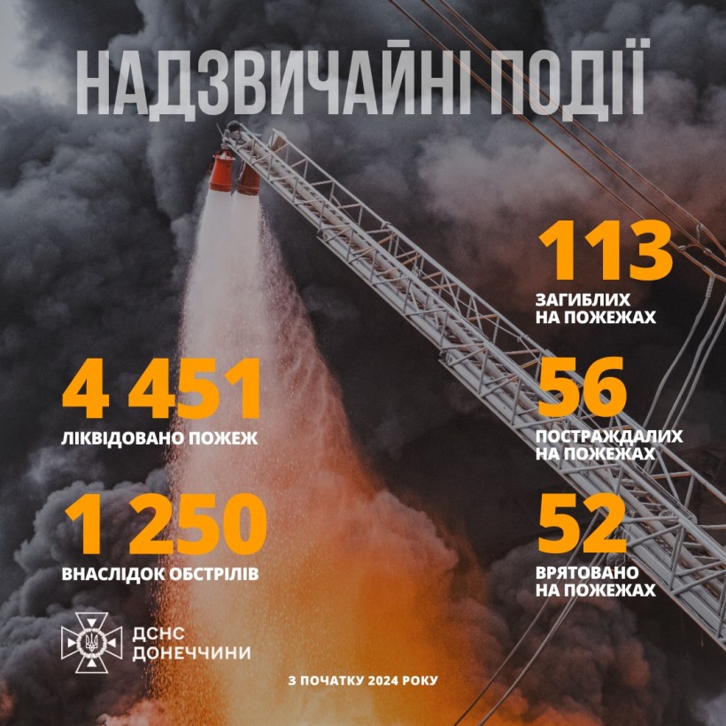Впродовж року вогнеборці Донеччини ліквідували понад 4 450 пожеж, з яких 1250 пожеж виникли через ворожі обстріли.