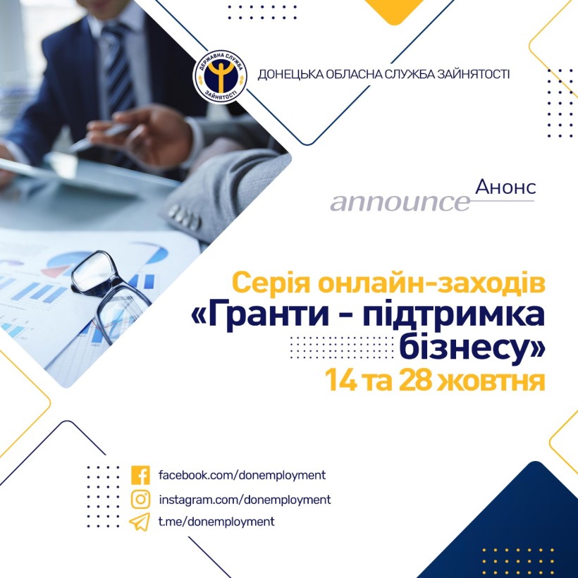Донецька обласна служба зайнятості запрошує на серію онлайн-заходів «Гранти – підтримка бізнесу», де ви зможете: