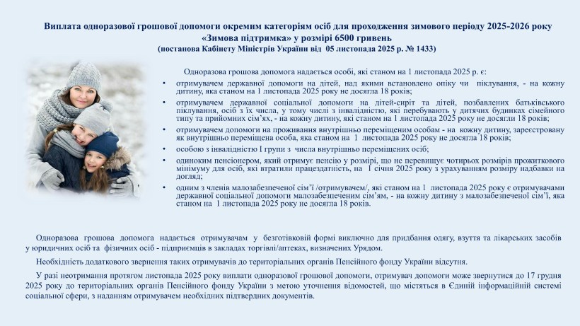 Урядом запроваджено виплату одноразової грошової допомоги окремим категоріям осіб для проходження зимового періоду 2025/26 року «Зимова підтримка» (далі - одноразова грошова допомога) у розмірі 6500 гривень (постанова Кабінету Міністрів України від 05 листопада 2025 р. № 1433 «Деякі питання підтримки окремих категорій осіб для проходження зимового періоду 2025/26 року «Зимова підтримка» (далі - постанова КМУ № 1433, https://zakon.rada.gov.ua/laws/show/1433-2025-%D0%BF).