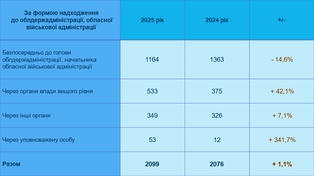 За підсумками 2025 року відбулось незначне збільшення надходження звернень громадян до облдержадміністрації на 1,1% (2099 звернень за 2025 рік проти 2076 звернень за 2024 рік). З загальної кількості звернень громадян, що надійшли до облдержадміністрації протягом 2025 року – 33 пропозиції або 1,6%, 1758 заяв або 83,8%, 308 скарг або 14,7%.