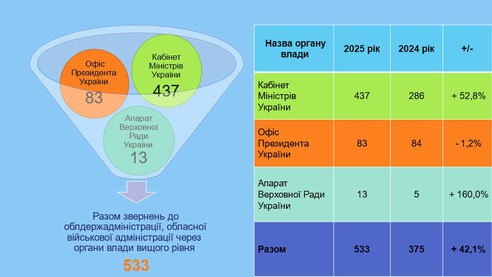 За 2025 рік, у порівнянні з минулим роком, відбулось зростання надходження звернень громадян через органи влади вищого рівня на 42,1% (533 звернення за 2025 рік проти 286 звернень за 2024 рік) переважно за рахунок збільшення надходження звернень громадян через Кабінет Міністрів України на 151 звернення або 52,8%, а саме: Секретаріат Кабінету Міністрів України та Міністерство розвитку громад та територій України. Через Апарат Верховної Ради України надходження зросло на 8 звернень, через Офіс Президента України, навпаки, зменшилось на 1 звернення.