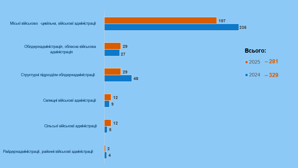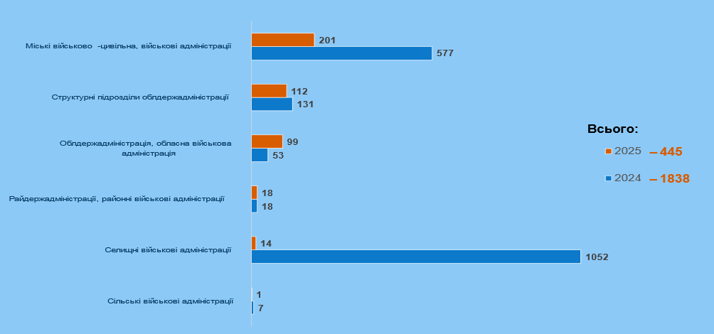 За підсумками 2025 року, у порівнянні з 2024 роком, відбулось зменшення надходження звернень громадян до структурних підрозділів облдержадміністрації на 22,2% (7901 проти 10156 звернень), райдержадміністрацій, районних військових адміністрацій – на 53,2% (553 проти 1182 звернень), сільських військових адміністрацій – на 26,4% (1449 проти 1969 звернень).