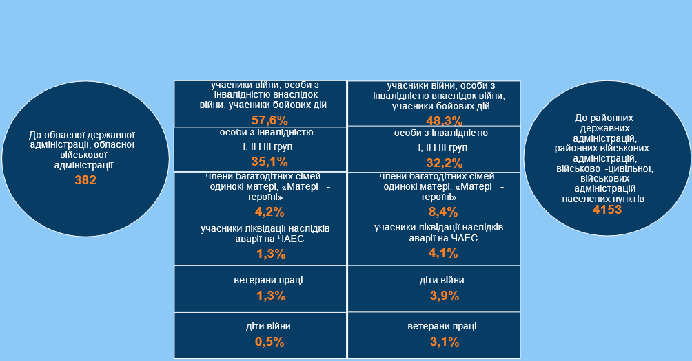 До райдержадміністрацій, районних військових адміністрацій, військово-цивільної, військових адміністрацій населених пунктів від пільгової категорії громадян протягом 2025 року надійшло на 11,1% більше звернень, ніж у минулому році (4153 проти 3739 звернень).