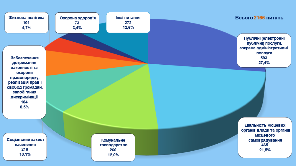 Найчастіше у своїх зверненнях громадяни порушували питання публічних (електронних публічних) послуг, зокрема адміністративних послуг – 593 питання або 27,4% від загальної кількості порушених питань, а саме: