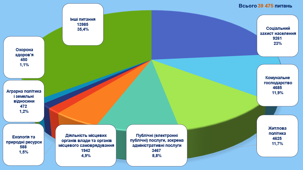 У зверненнях до райдержадміністрацій, районних військових адміністрацій, військово-цивільної, військових адміністрацій населених пунктів, виконавчих апаратів обласної та районних рад протягом 2025 року громадяни порушили 39475 різноманітних питань, що на 7,4% більше, ніж у 2024 році (36766 питань).