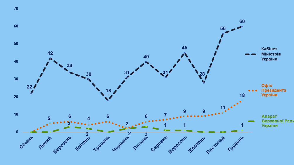 Згідно з помісячною динамікою надходження звернень громадян до облдержадміністрації через органи влади вищого рівня протягом 2025 року зафіксовано наднизьке надходження у січні та травні поточного року, з лютого по квітень та з червня по жовтень спостерігались удвічі більші показники, з досягненням пікових значень у листопаді – грудні 2025 року.